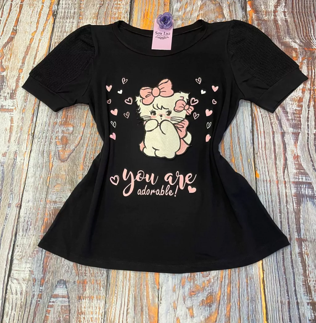 Tecido viscolycra com manga tricozinho e bordado costurado na blusa.