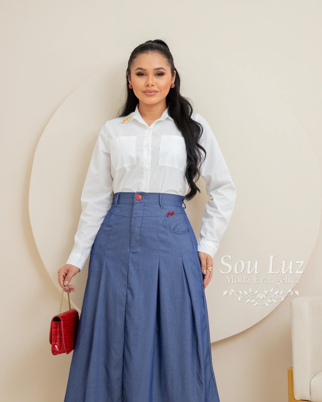 Camisa com aplicação em pedrarias na cor prata e na gola pedras coloridas.
