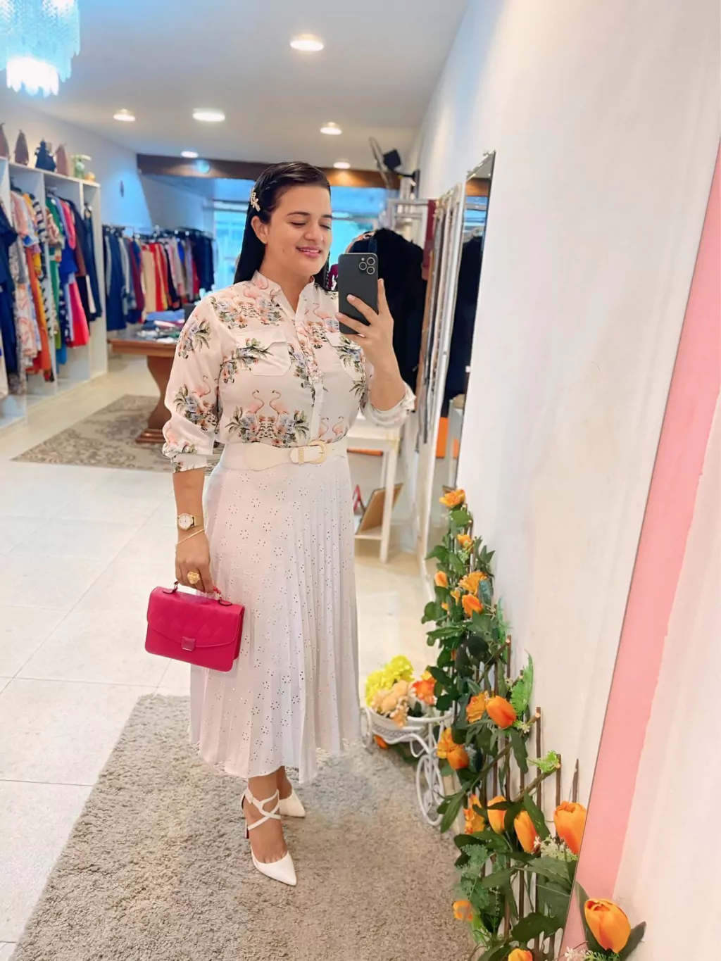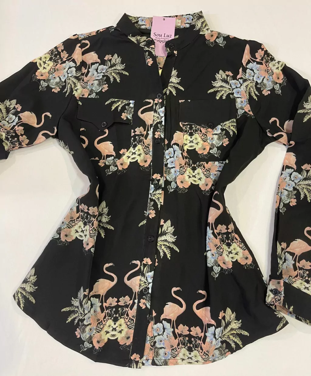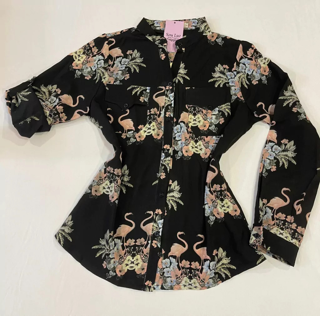 Tecido crepe leve, com estampas em flamingos.