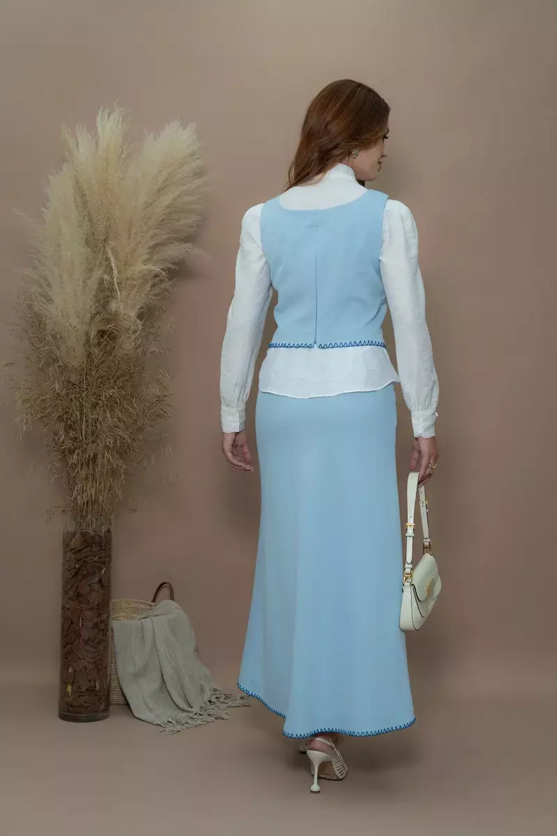 Conjunto em alfaiataria premium , saia evasê c/elástico na cintura top sem manga bordado (100% poliéster )
