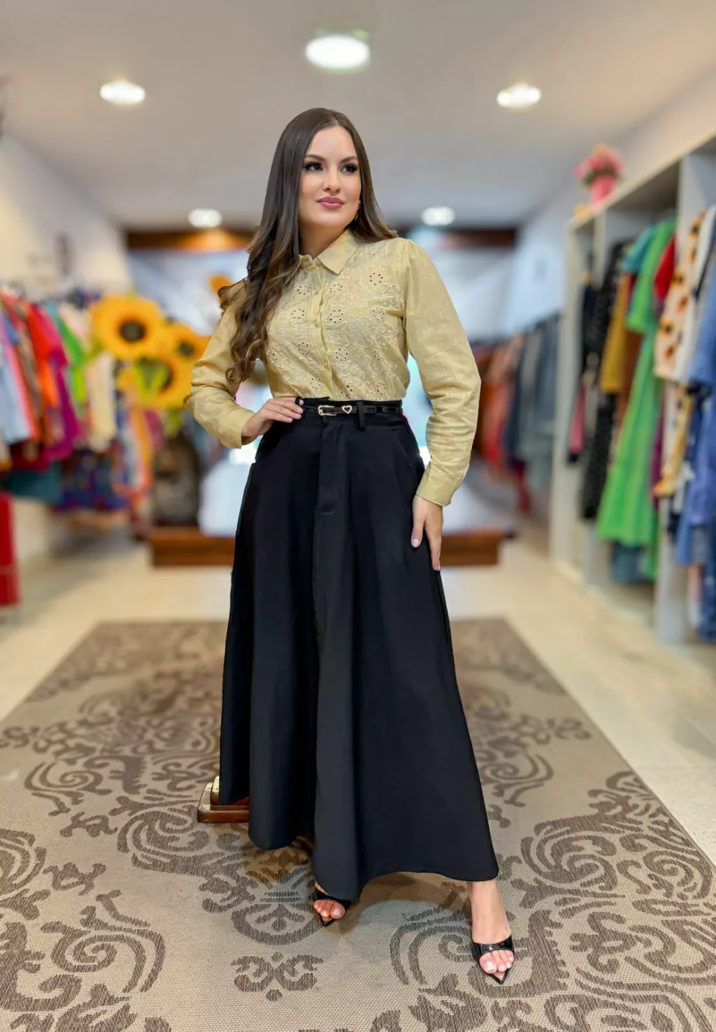 Tecido alafaiataria com bolsos funcionais, zíper e passante para o cinto. ( Não acompanha o cinto).