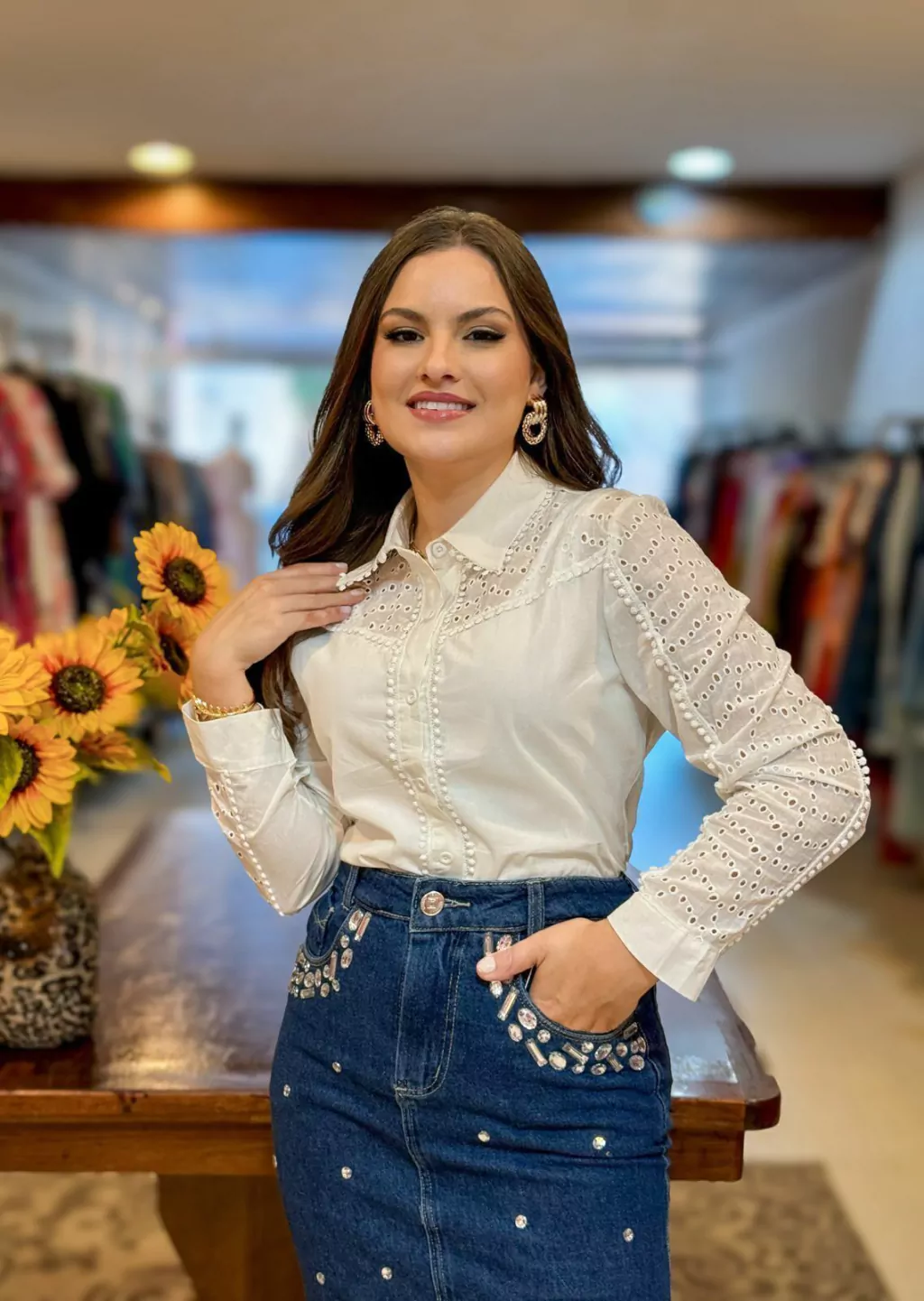 Tecido Jeans sem lycra com aplicação em pedraria, com bolsos funcionais.