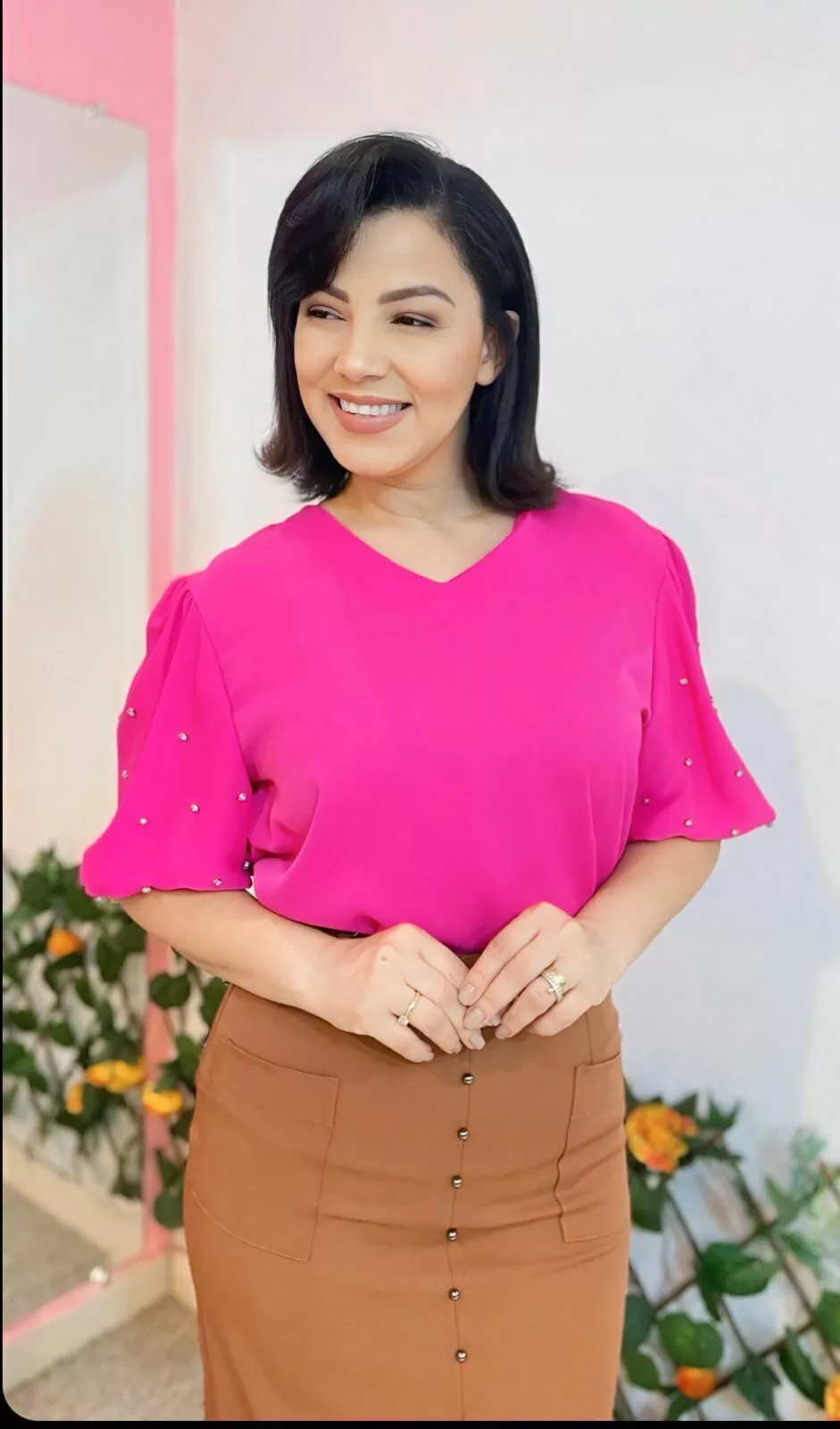 Tecido poliamida alfaiataria com corte reto! Bolsos funcionais e botões em perolas mas não são funcionais.
