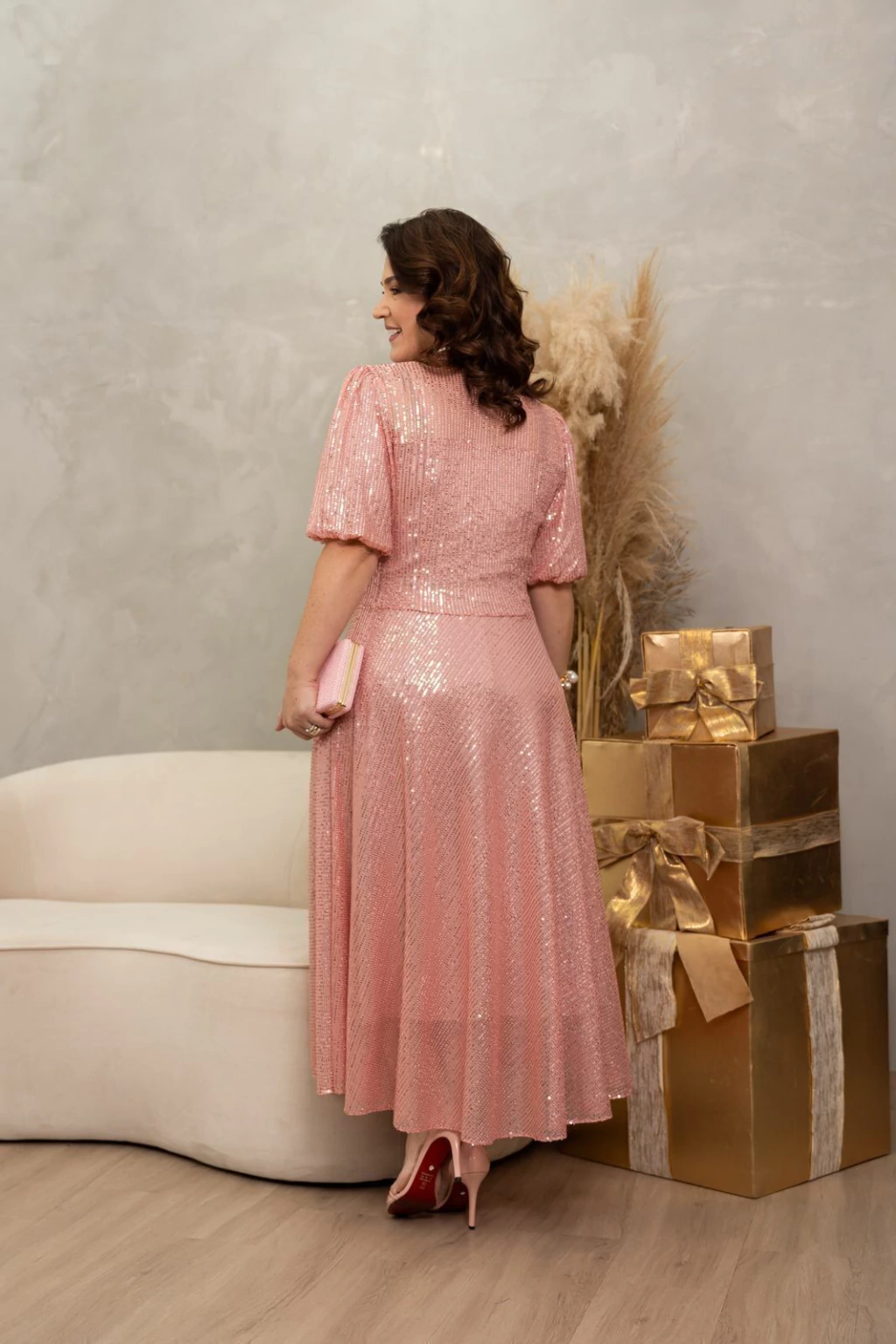 Um verdadeiro show de elegância e brilho, o vestido max midi todo em paetê é a escolha perfeita para ocasiões especiais. Com comprimento abaixo dos joelhos e levemente alongado na parte de trás, ele equilibra sofisticação com um toque moderno.
